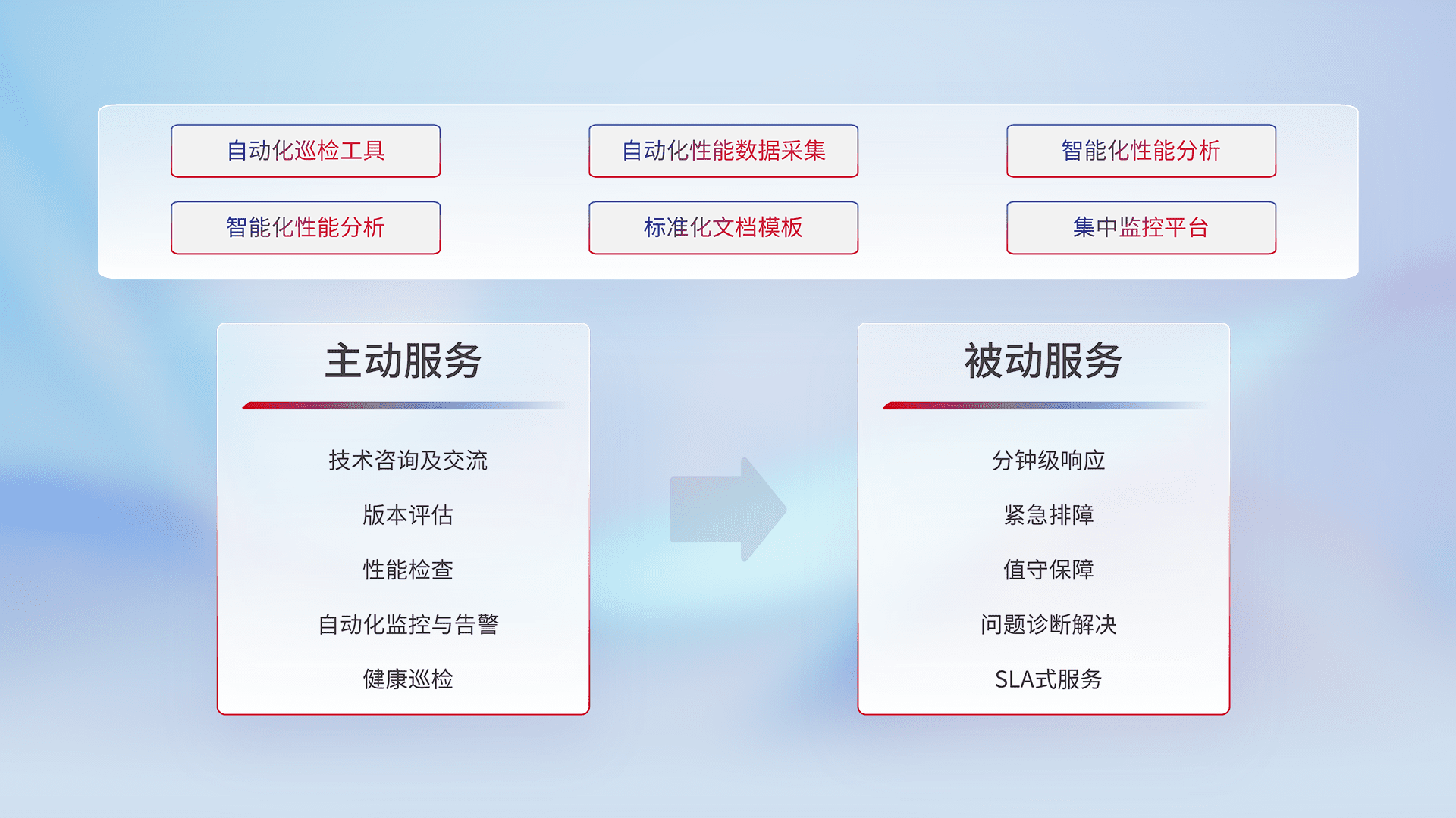 智能化工具和标准化文档,,,,保障服务质量,,,,提供主动服务(包含技术咨询、、、版本评估、、、性能检查、、、自动化监控与告警、、、、健康巡检)和被动服务包含(分钟级响应、、紧急排障、、、、值守保障、、问题诊断解决、、、SLA服务)。。。。